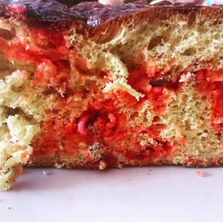 5. Après la première pousse, bien fariner le plan de travail et y déposer la pâte. l'étaler à la spatule au avec la paume de la main qu'on aura légèrement farinée. et y déposer un tiers environ des pralines, rabattre la pâte sur les pralines et recommencer de même avec un autre tiers, puis le dernier. Toutes les pralines sont désormais incorporées à la pâte. on peut la disposer dans le moule et la dorer une première fois au pinceau.